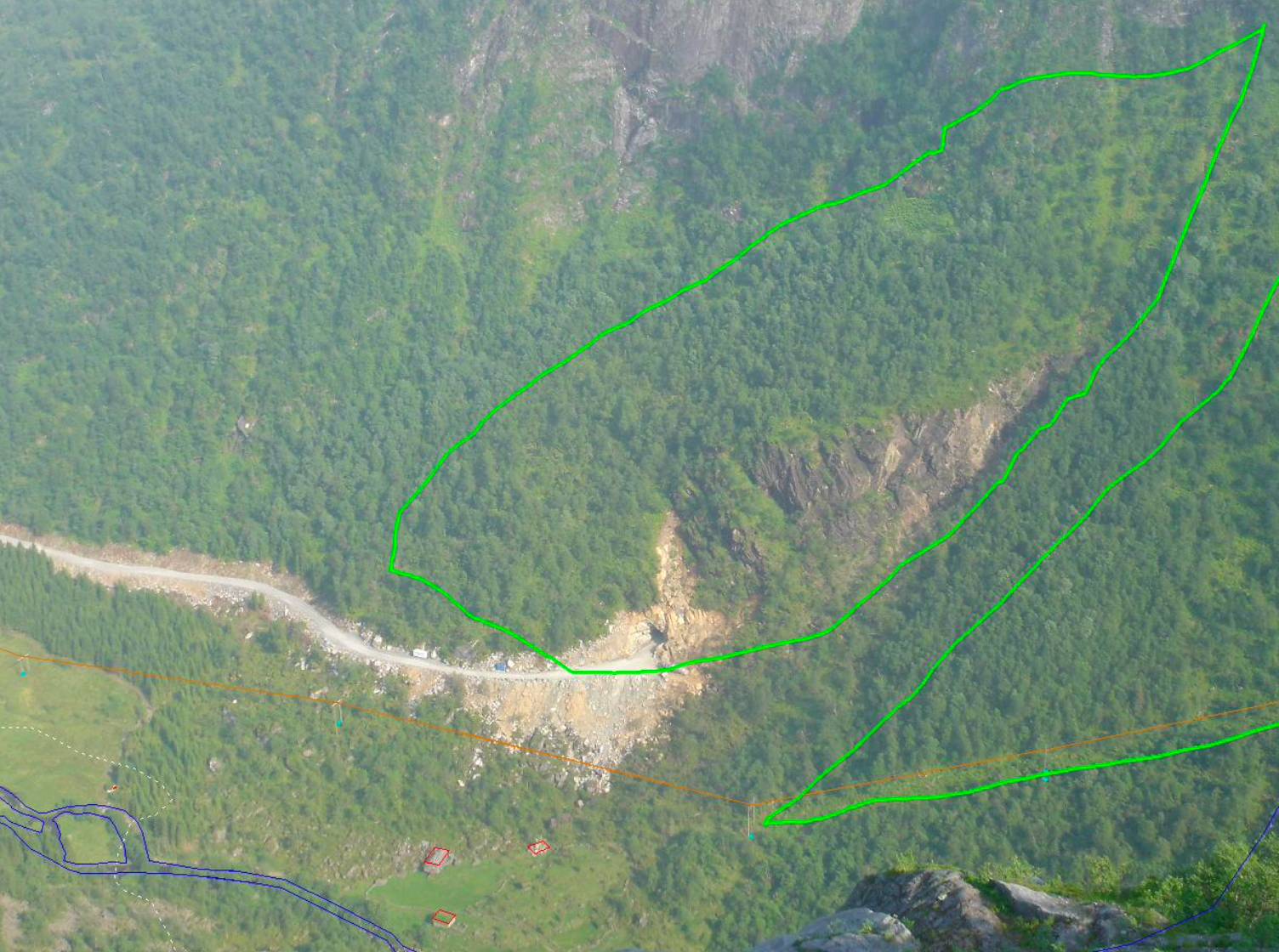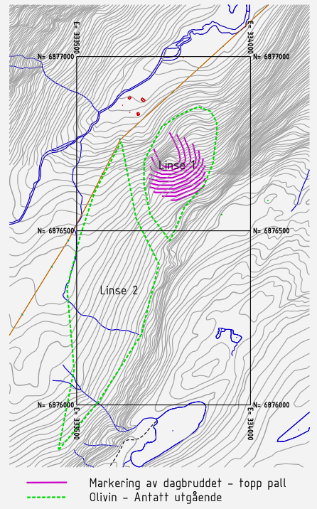 The olivine deposit consists of at least two separate lenses, lens 1 and lens 2, as shown in the figure. Between lens 1 and lens 2 there is a gneiss zone with a thickness of 35–50 m.